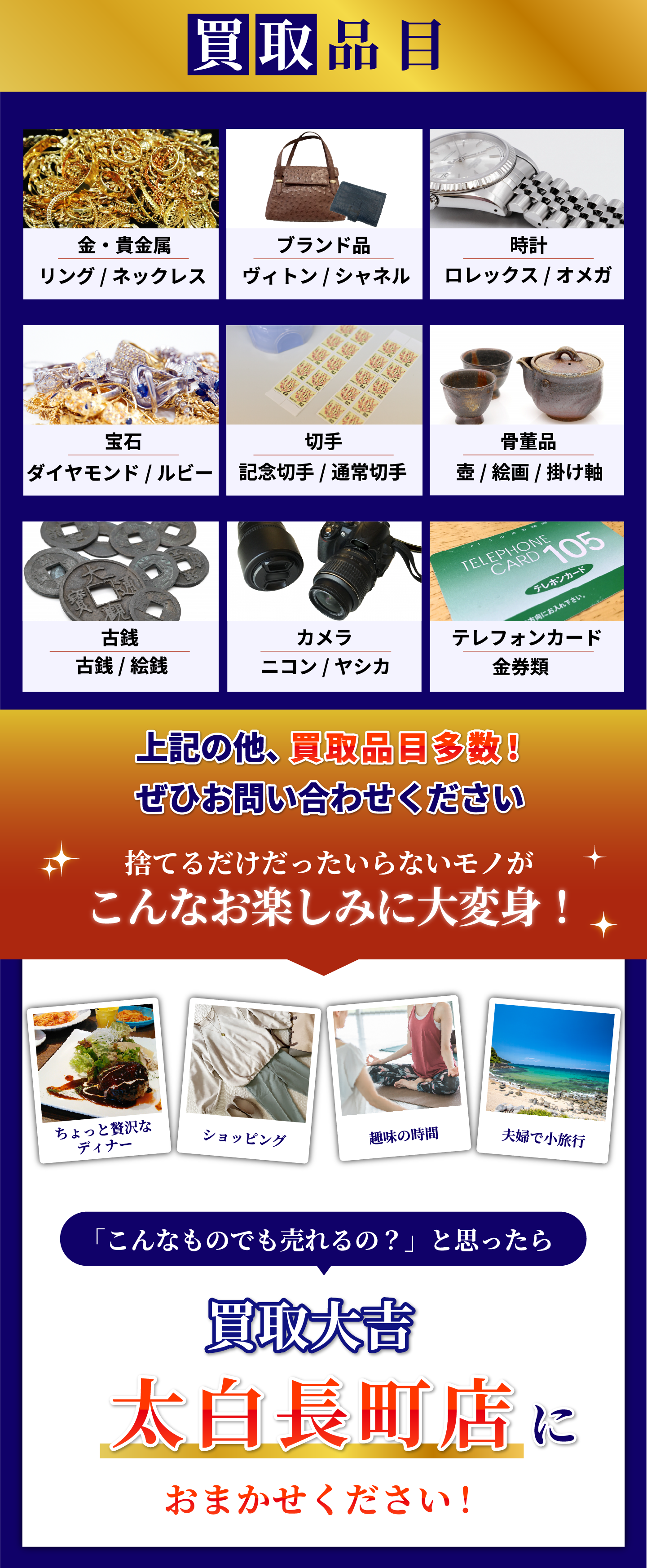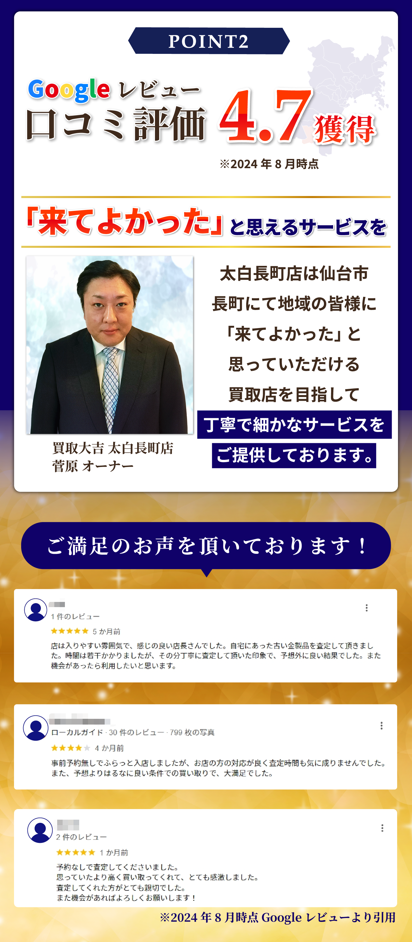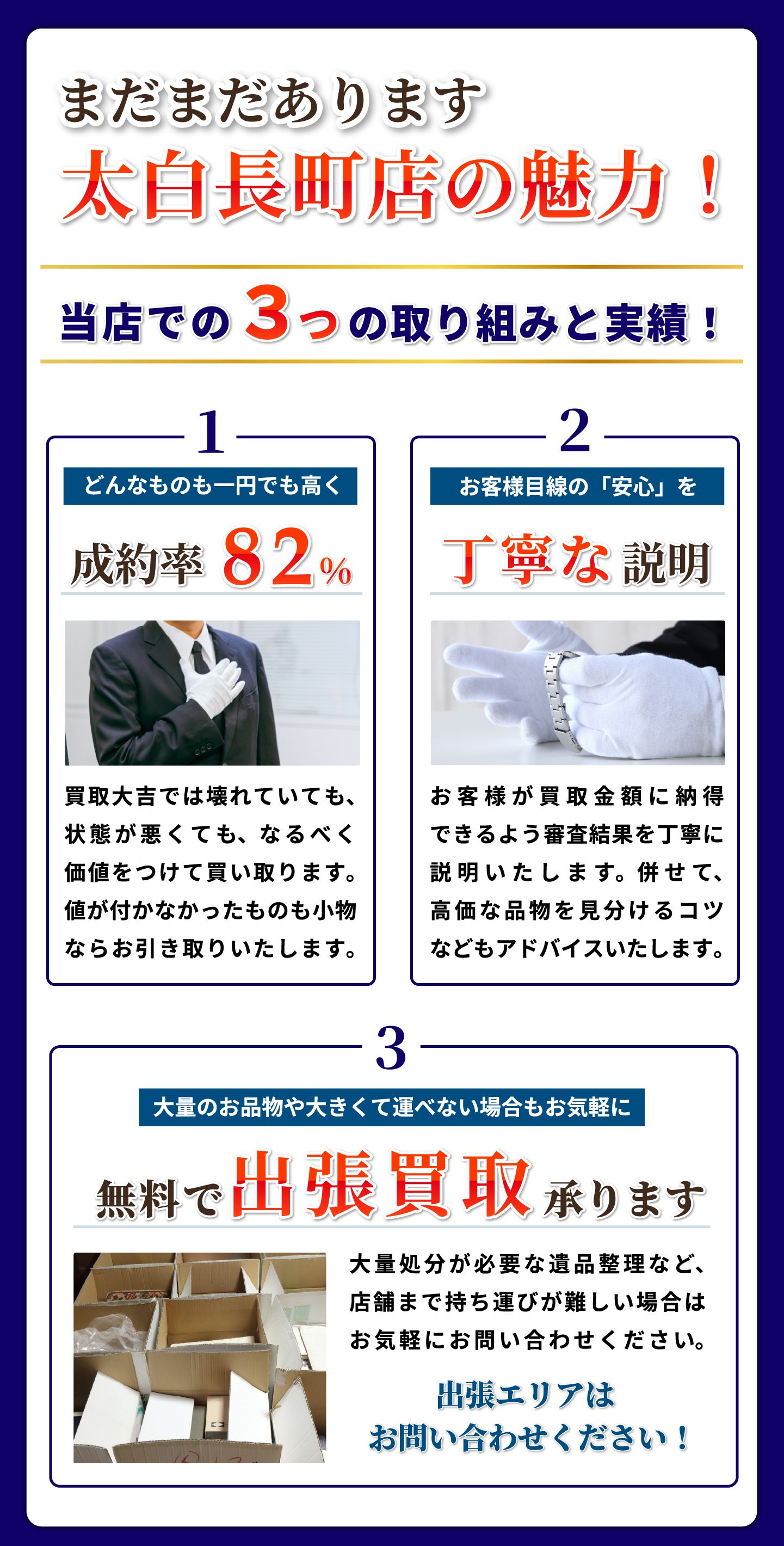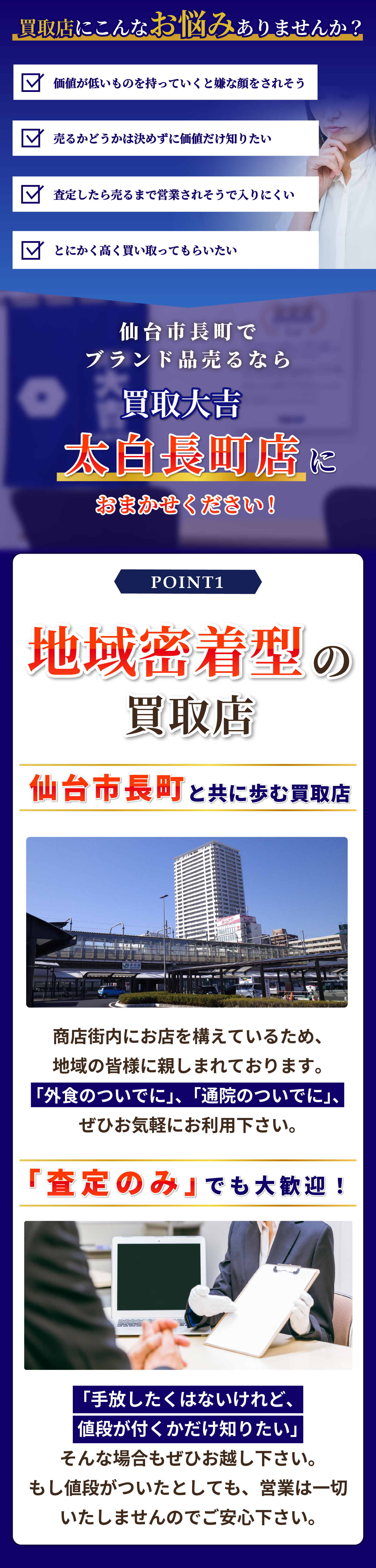 買取大吉 太白長町店 (以下「当社」)は、以下のとおり個人情報保護方針を定め、 個人情報保護の仕組みを構築し、全従業員に個人情報保護の重要性の認識と取組みを 徹底させることにより、個人情報の保護を推進致します。 個人情報の管理 当社は、お客さまの個人情報を正確かつ最新の状態に保ち、個人情報への不正アクセス・紛失・破損・改ざん・漏洩などを防止するため、セキュリティシステムの維持・管理体制の整備・社員教育の徹底等の必要な措置を講じ、安全対策を実施し個人情報の厳重な管理を行ないます。